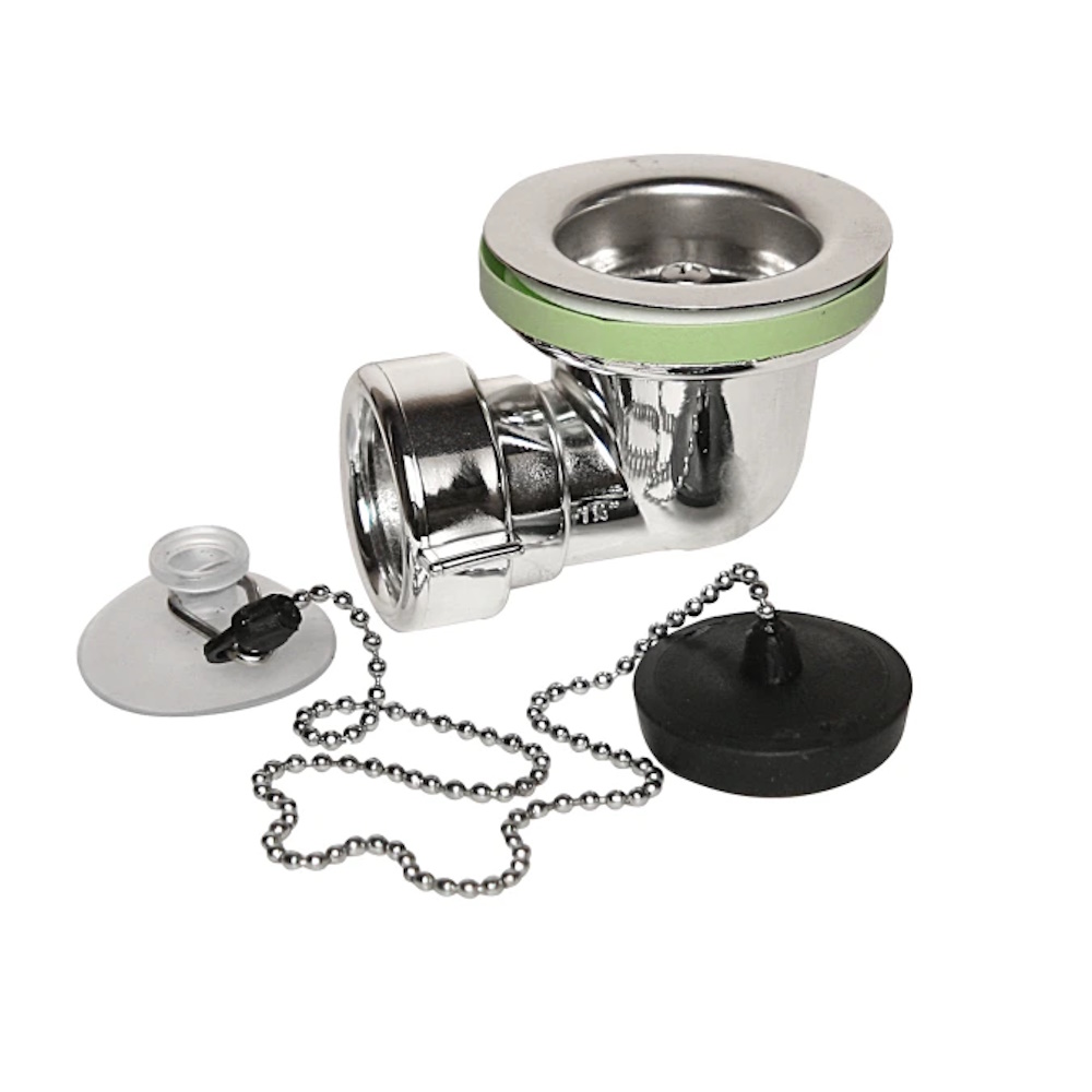 Bottenventil i vinkel med rostfri sil samt kedja och sugpropp.