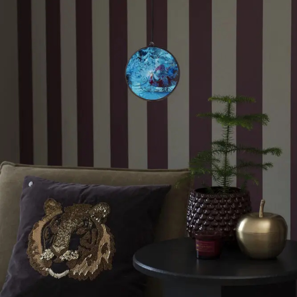 Juldekoration i form av en julkula med film på tomte och släde, fungerar att hänga upp eller för bordsplacering, timerfunktion på 2h.