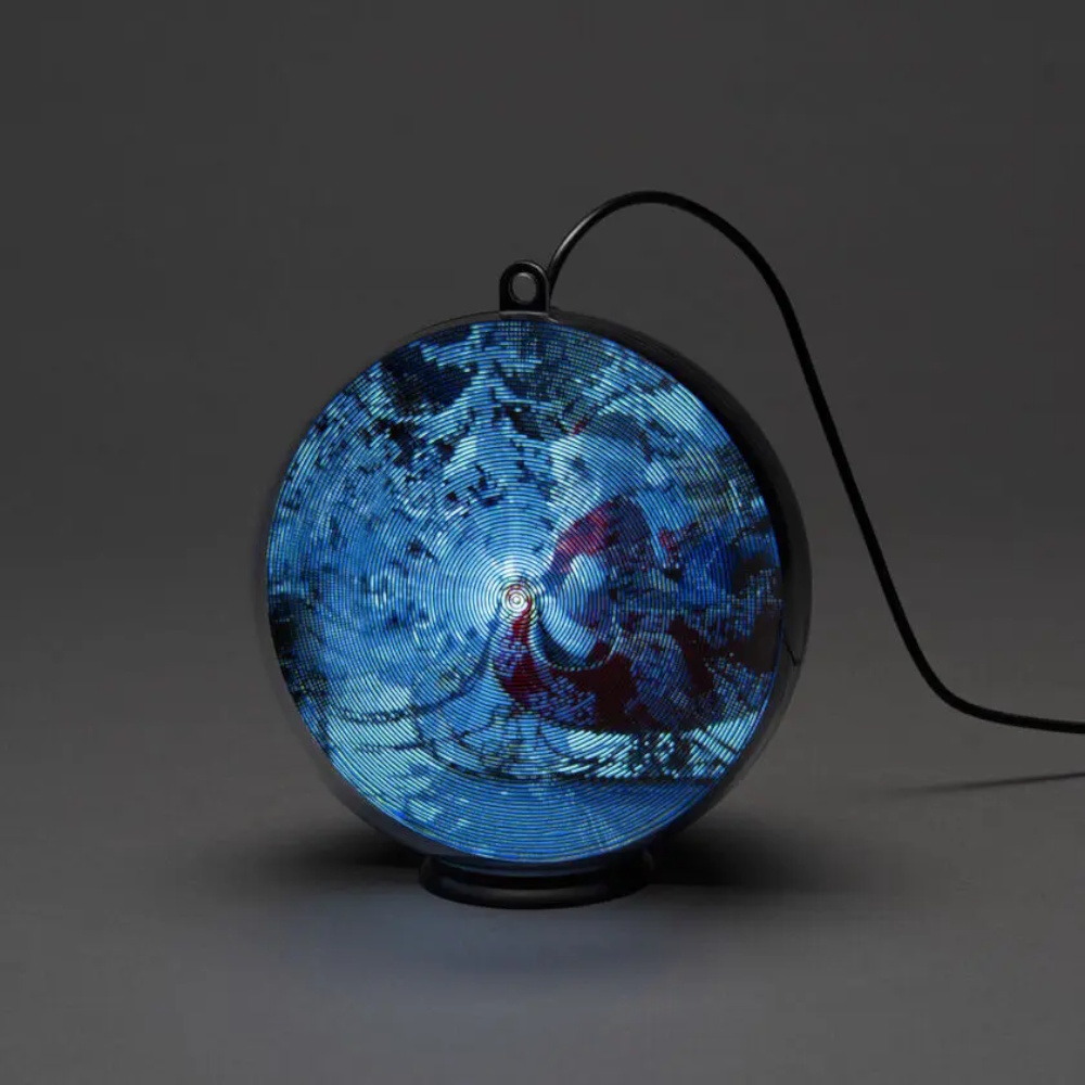 Holoball juldekoration i form av en julkula med film på tomte och släde. Färgade LED och drivs med en USB sladd. Fungerar att hänga upp eller för bordsplacering. Timerfunktion på 2h. Diameter 15cm.