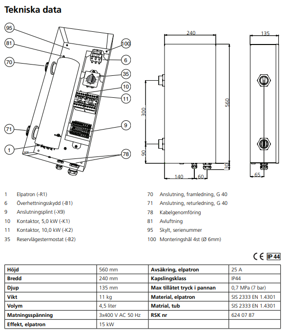 ELK 15 En elkassett är i princip en elpatron monterad i en vattenbehållare, eller en elpanna utan varmvattenberedare. Elslingorna är som standard av rostfritt stål. ELK 15 innehåller överhettningsskydd samt kontakter för att externt kunna reglera de två effektgruperna 5 och 10 kW.