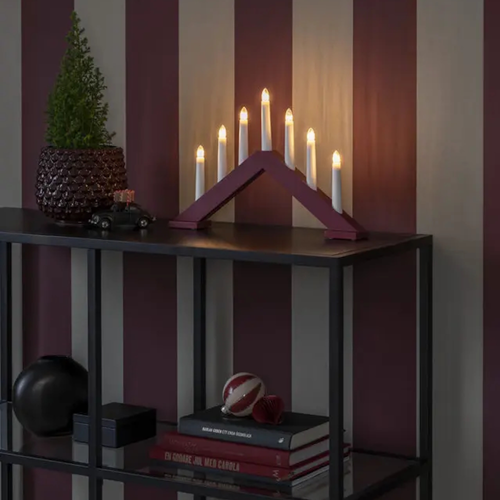 Klassisk 7-armad adventsljusstake i trä med varmvita lampor. Lackad i en matt mörkröd färg. Anslutningssladd på 1,7 meter. Strömbrytare.