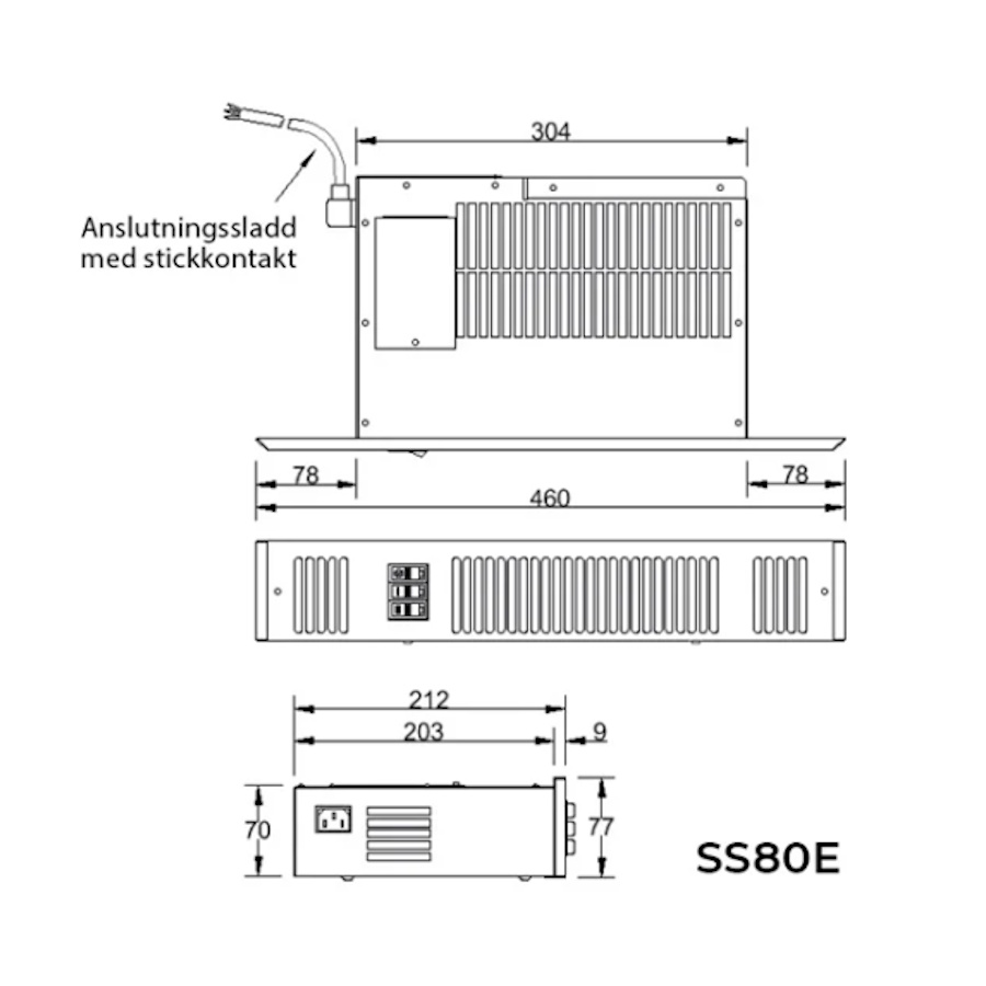 Elvärmd fläktkonvektor Kan ersätta radiator i ett kök. Monteras i sockellåda min 80mm hög. Inklusive batteridriven trådlös termostat.