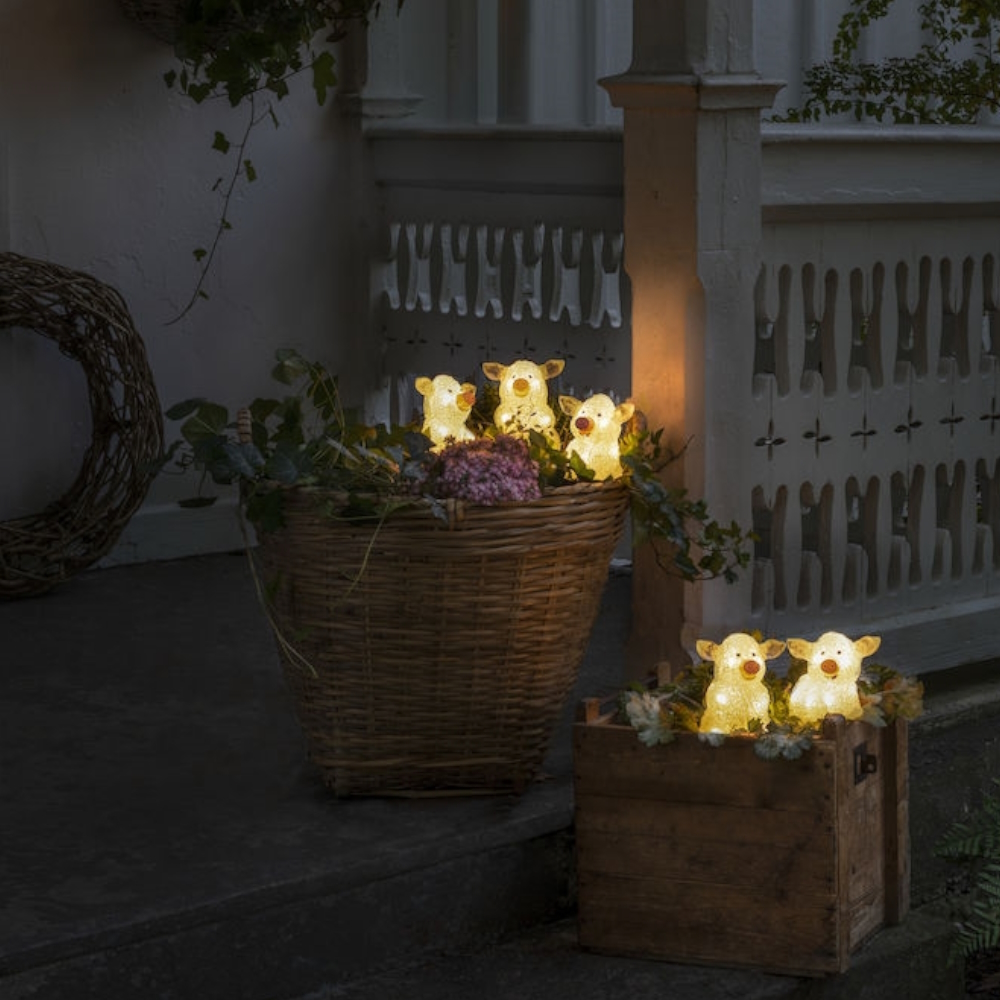 Låt dessa fem sittande grisar sprida sitt mjuka sken över trädgården eller balkongen. Ljusslingan är tillverkad i tålig akrylplast och lyser upp med 40 varmvita LED-lampor – perfekt för både inom- och utomhusbruk. Med en meter mellan varje gris får ljuset gott om plats att glimma, och den diskreta, transparenta sladden smälter snyggt in i omgivningen. En sagolik dekoration som drivs tryggt med 24V transformator.