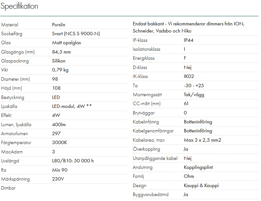Ifö Electric Armatur Ohm 100/110 LED 3000K Svart