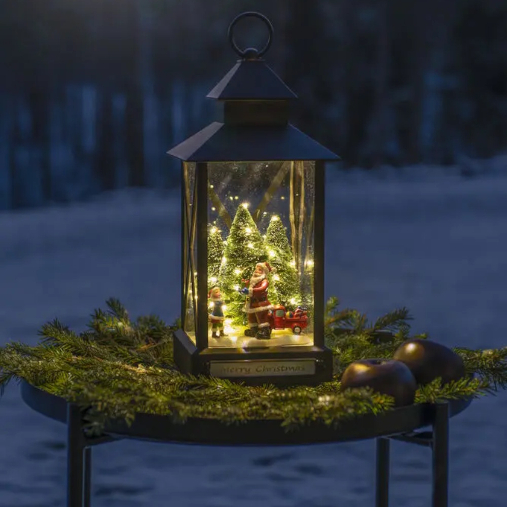 En liten dekorativ lykta med jultomte och belysning, godkänd för utomhusbruk och är även utrustad med en 8-timmars timer.