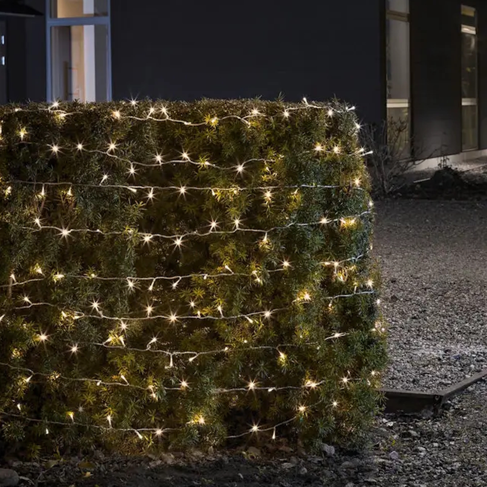 Ljusslinga från Konstsmide med 80 varmvita LED-ljus och transparent kabel. Ljusslingan har skymningssensor och timer på sex eller nio timmar.