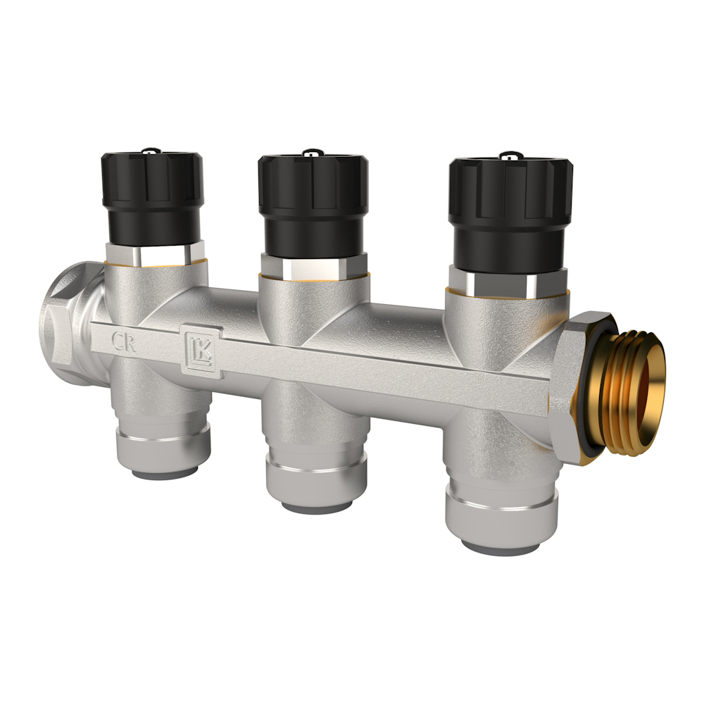 åbyggnadsbar fördelare för värme- och tappvattensystem, Tillverkad av avzinkningsbeständig mässing, förnicklad.