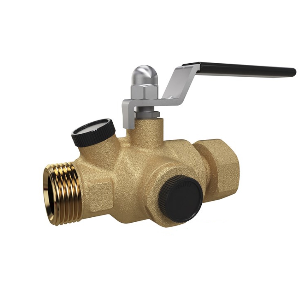 En kulventil med integrerat backventil, passar till LK Paralellkopplad Vattenmätarkonsol (LK PVK), pil på ventilhuset anger flödesriktning.
