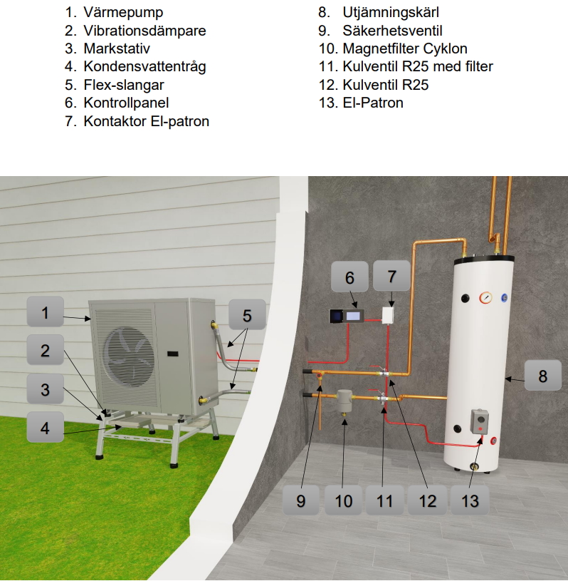 Här kommer en kort överblick över var alla delar är placerade. Observera att detta är enbart är en produktbild och ej ett installationsexempel.