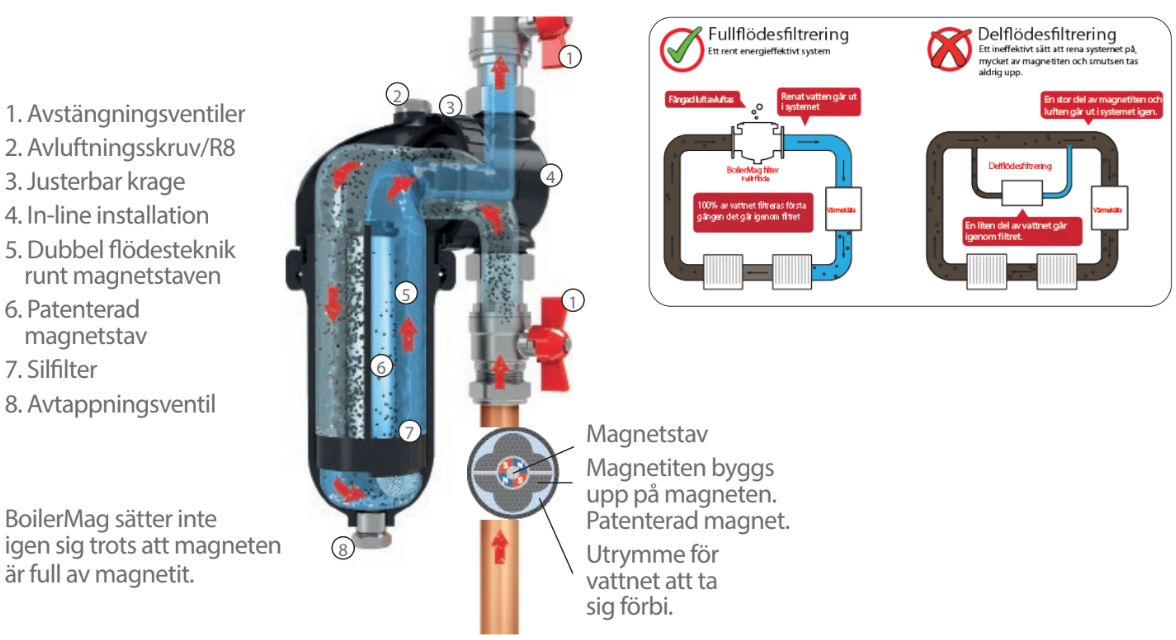 Magnetitfilter som tar upp befintlig magnetit i ditt vattenburna värmesystem samt skyddar det mot ny magnetit som bildas.
