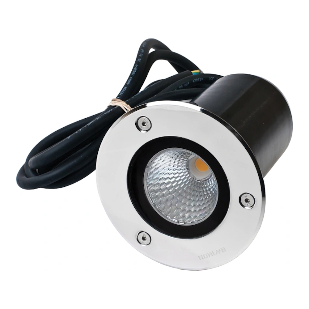 Markarmatur. Front i rostfritt stål. Frostat glas. Armaturhus i aluminium. 10mm härdat glas. Rund modell. 3 meter färdigmonterad kabel medföljer. Infällningsbox i polypropylen för nedgrävning/ingjutning medföljer.