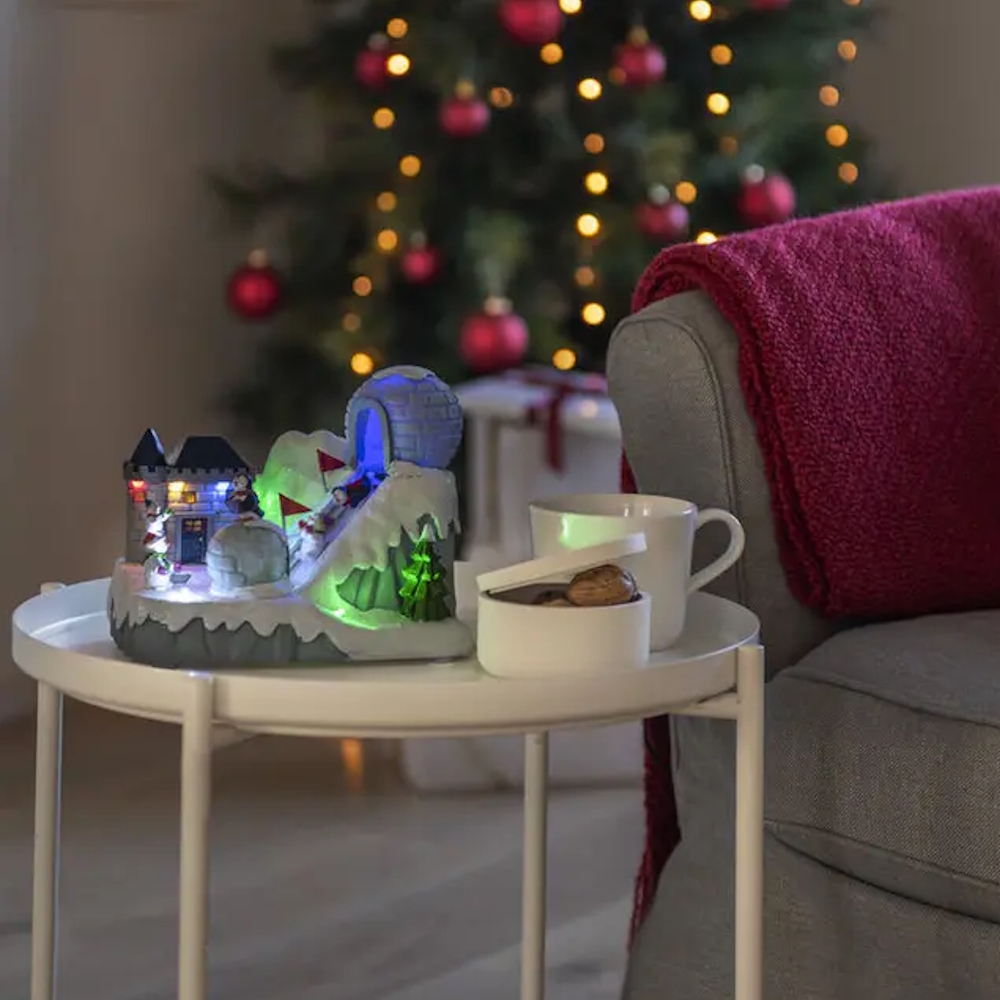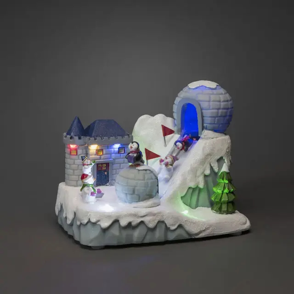 Julby med glada pingviner och snögubbar som åker kana från en igloo i vintermiljö. Med mysig belysning och musik (8 låtar) skapas en varm atmosfär. Juldekorationen är en given favorit!