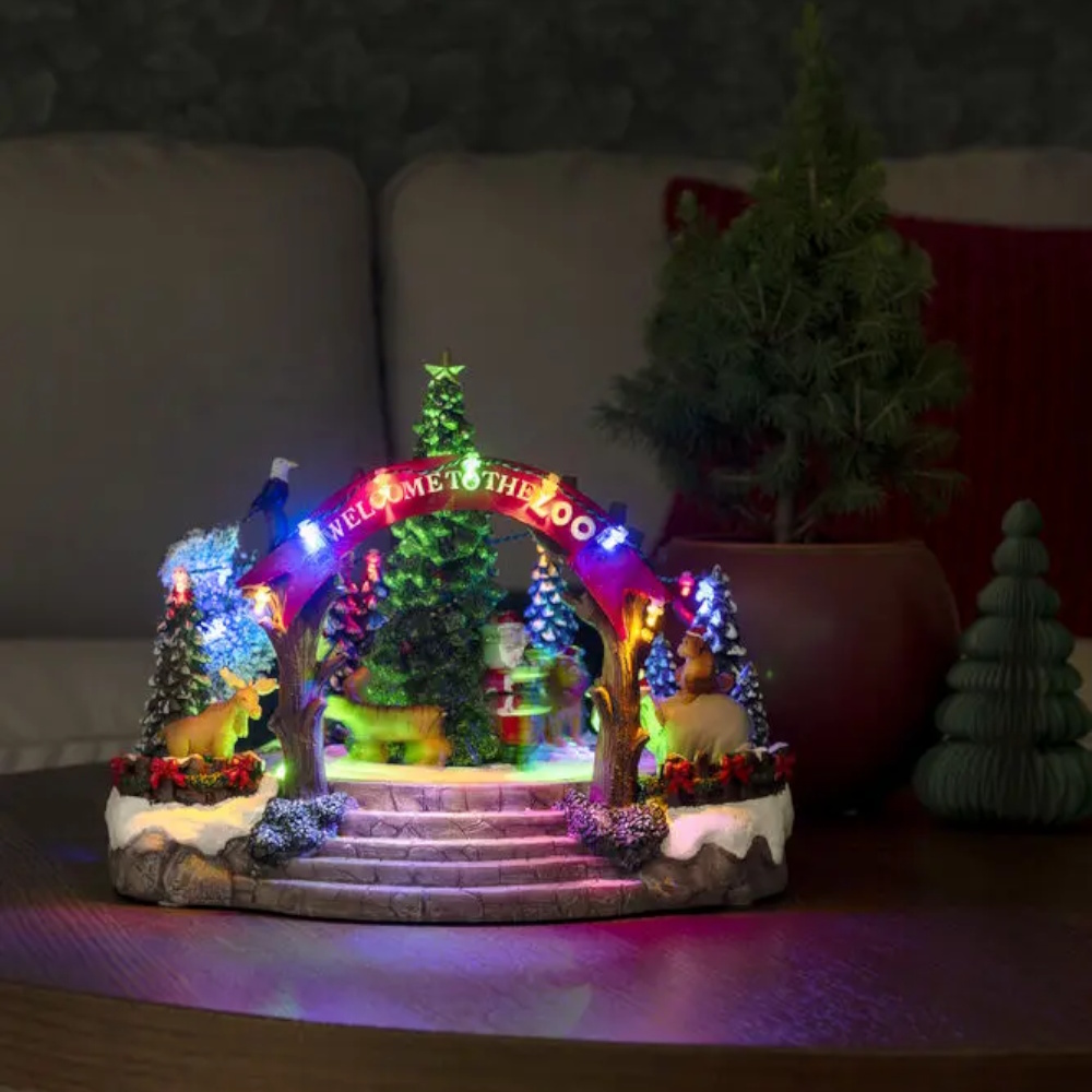 Djuren på zoo firar jul! Tomten dansar runt julgranen med lejon, tiger och giraffer, medan elefanten, apan och älgen tittar på. Julby med mysig belysning och musik (8 låtar) som skapar en varm atmosfär. Juldekorationen är en given favorit!