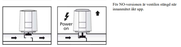 Vid NO versionen stängs ventilen av kolvrörelsen när du slår på driftspänningen och efter utgången av den döda tiden. Efter att driftspänningen har stängts av och efter utgången av hålltiden öppnas ventilen med tryckfjäderns stängningskraft.