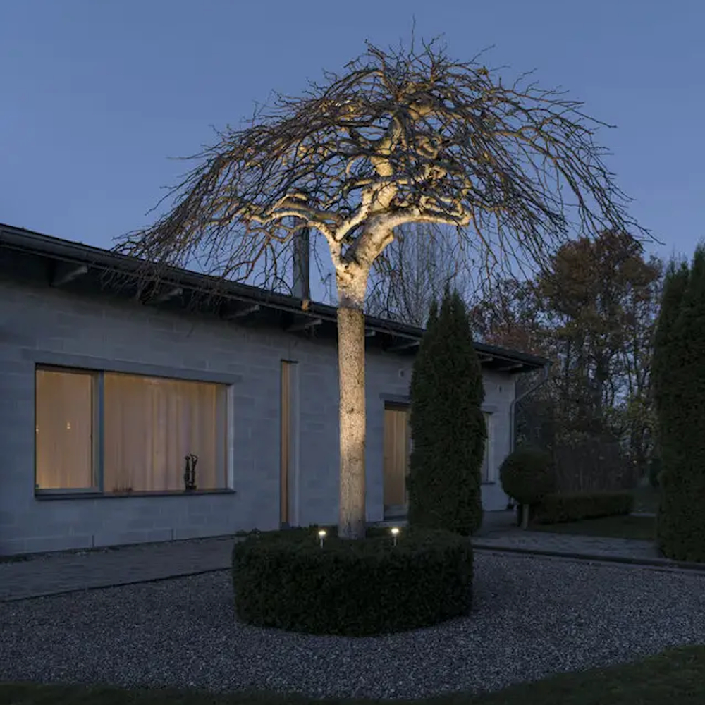 Monza dekorationsbelysning i anodiserad aluminium ingår i det utbyggbara 12V systemet. Set med 2x3W LED som drivs av 12V transformator. Elegant trädgårdsbelysning som lyser upp träd, buskar och annat.