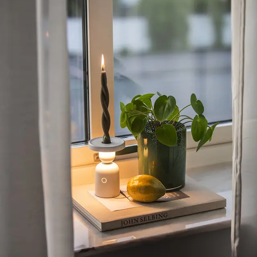 Nantes är en stilren bordslampa/ljusstake med ställbar belysning där man kan välja färgtemperatur mellan 2200K eller 2700K och är dimbar. Den passar lika bra inne i vardagsrummet som på uteplatsen. Laddas via USB och har en batteritid på ca 9 timmar vid full ljussstyrka. Av/på knapp i touch på foten. Vit lackad aluminium.