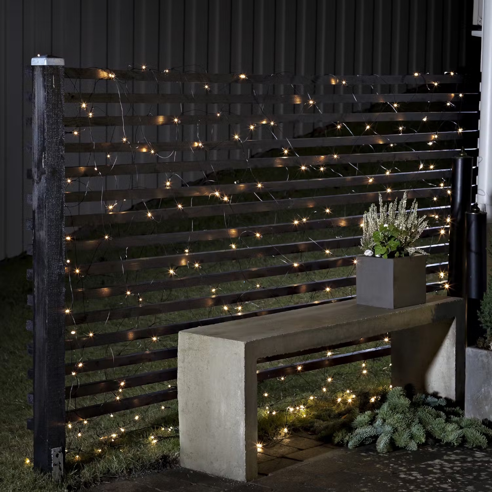 Ljusnät med LED-ljus, svart kabel samt box. Ljusnätet har skymningssensor och timer på sex eller nio timmar. 5 m anslutningssladd med kopplingsplugg till boxen.