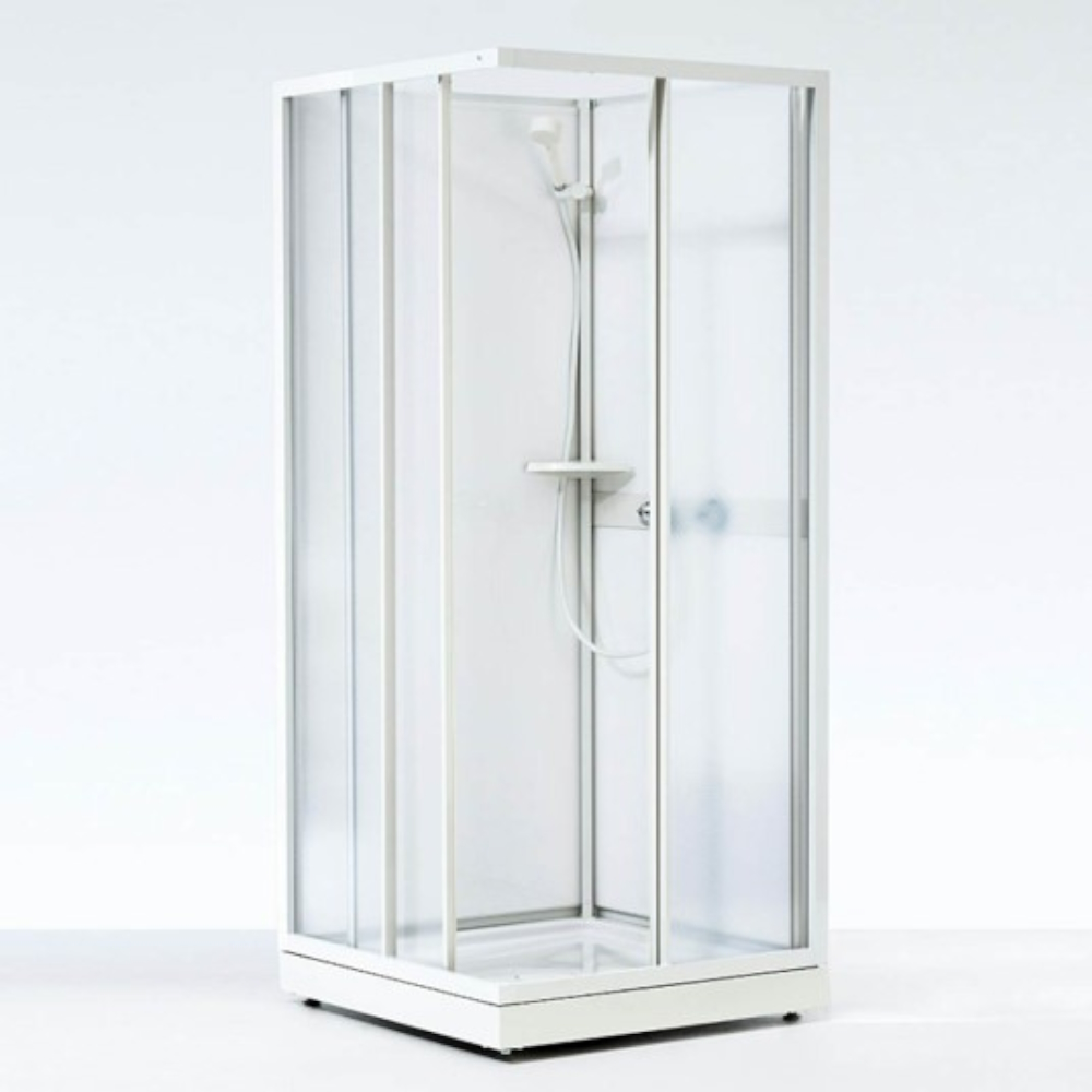 Komplett duschkabin låg modell 80x80. Skjutdörrar i diskret mönstrad styrén. Bakstycken i vit styrén med vitlackerade profiler.