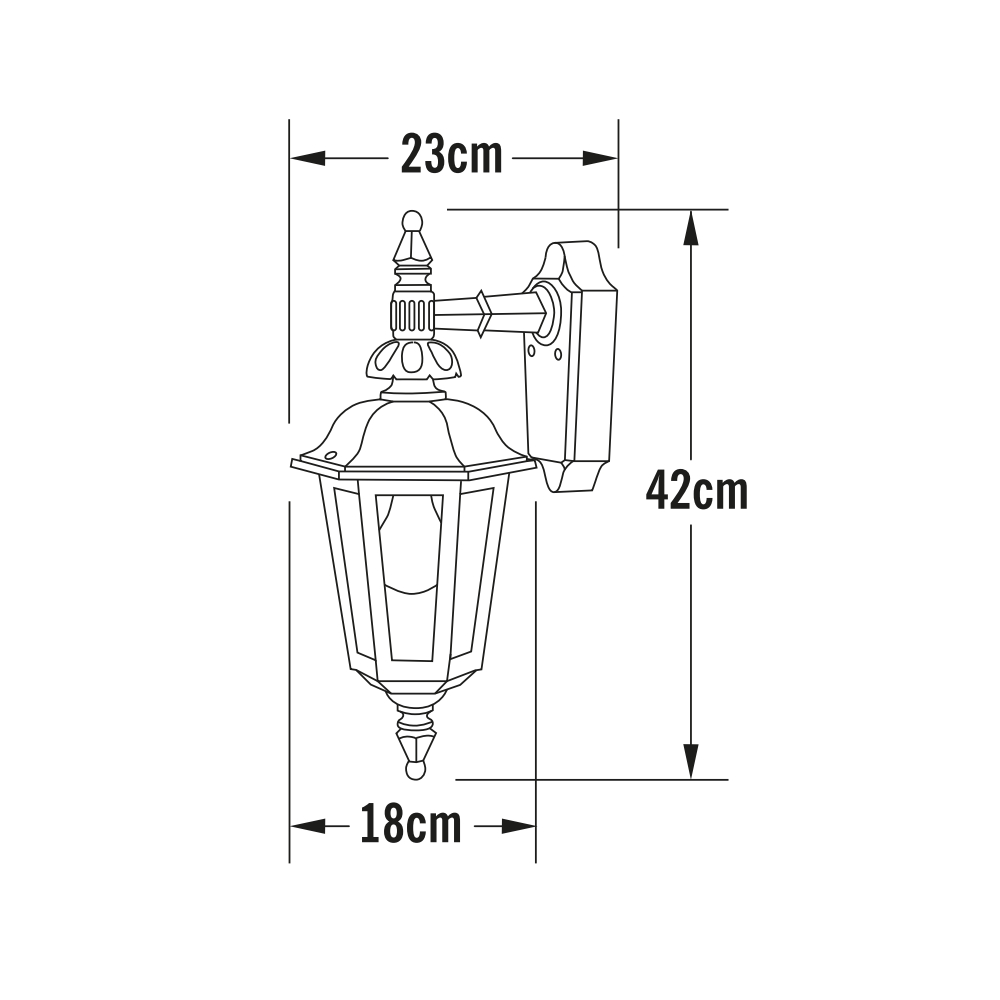 Stilren, nedåtriktad vägglykta i klassisk lanternstil handgjord i vitlackad aluminium och med rökfärgat akrylglas. Den är certifierad för utomhusbruk med IP23-klassificering, vilket skyddar mot lätt regn och spray. Armaturen har sockel E27 och är kompatibel med ljuskällor upp till 60W (lampa ingår ej), och kan dimras om du väljer rätt typ av ljuskälla. Den är även anpassad för LED-lampor.