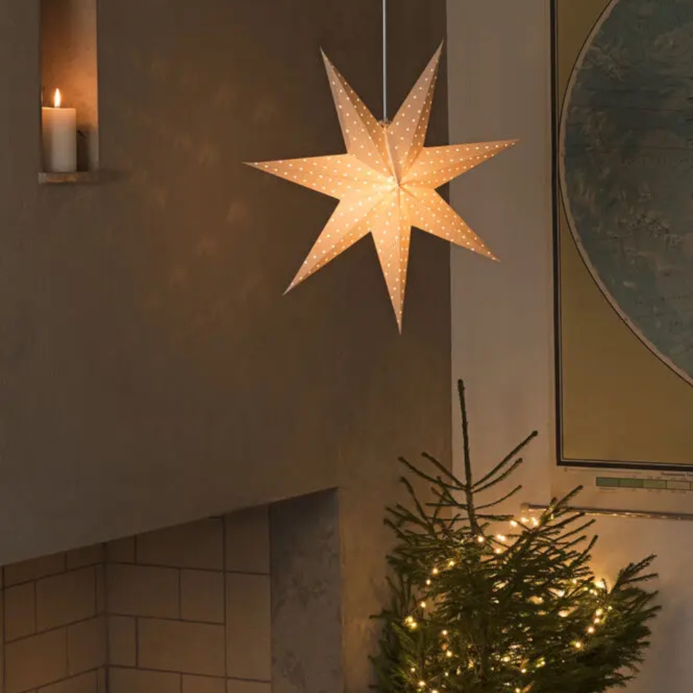 Klassisk hängande julstjärna i papper med sju uddar. Den är 60cm i diameter, avsedd för inomhusbruk och levereras med ett vitt sladdställ på 5 meter med strömbrytare samt E14-sockel (ljuskälla ingår ej). IP20-klassad och enkel att hänga upp för stämningsfull julbelysning.
