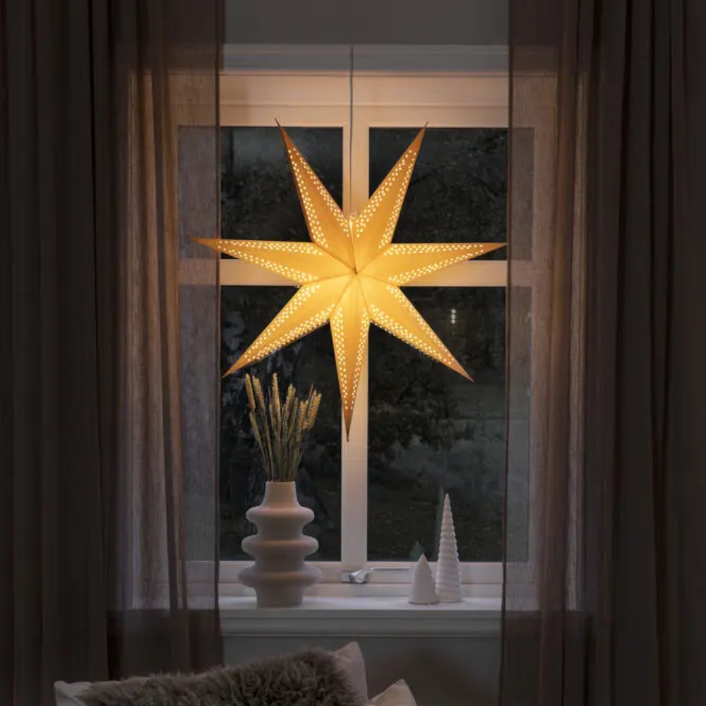Adventsstjärna i brunt med hålmönster som ger en vacker ljusbild. Sladdställ med E14 sockel ingår (ljuskälla ingår ej). Diameter 78cm.