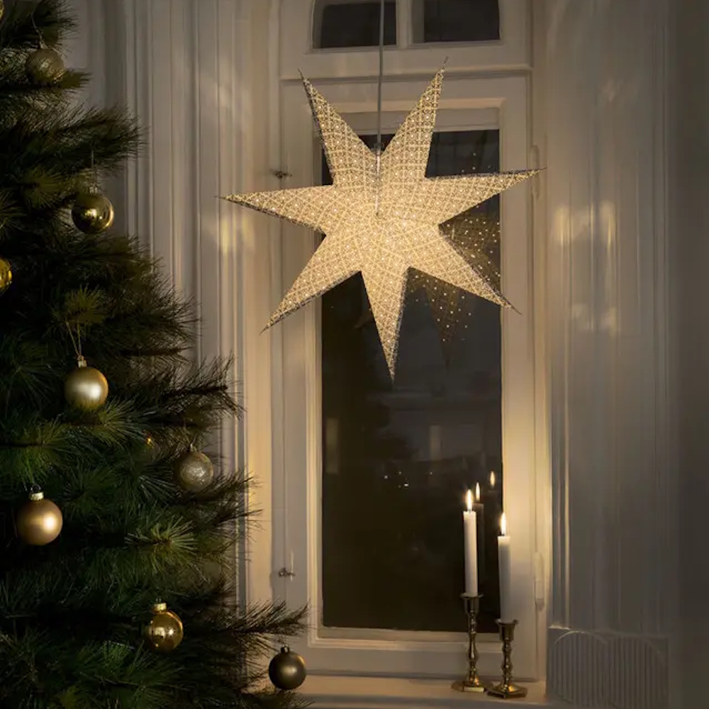 Hängande pappersstjärna från, mått 60x60cm, inklusive sladdställ och 5m anslutningssladd.