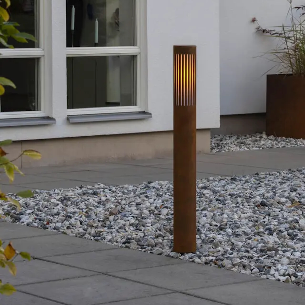 Lys upp din trädgård med Pistoia, en modern pollare med effektfull ljusbild i rostfärgad, lackad aluminium och opalt plastglas.