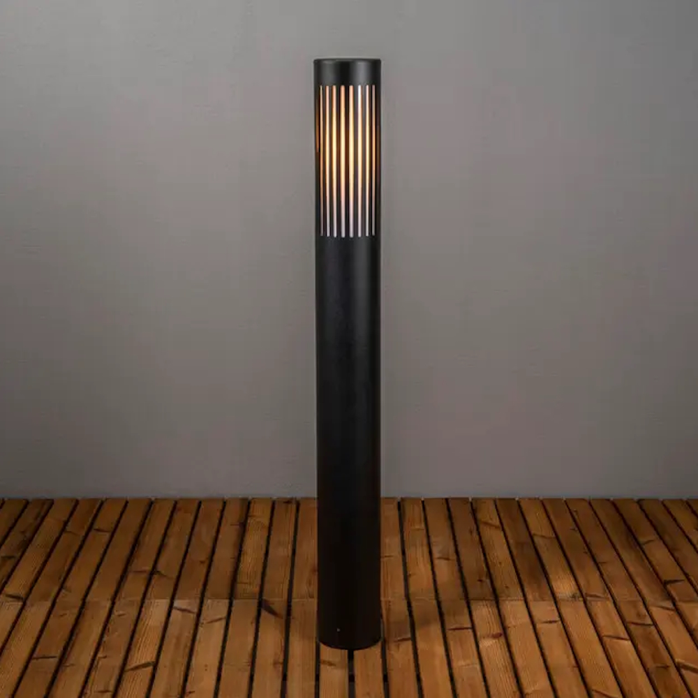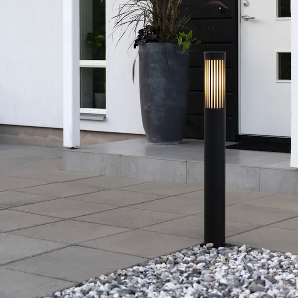 Lys upp din trädgård med Pistoia, en modern pollare med effektfull ljusbild i svartlackad aluminium och opalt plastglas.