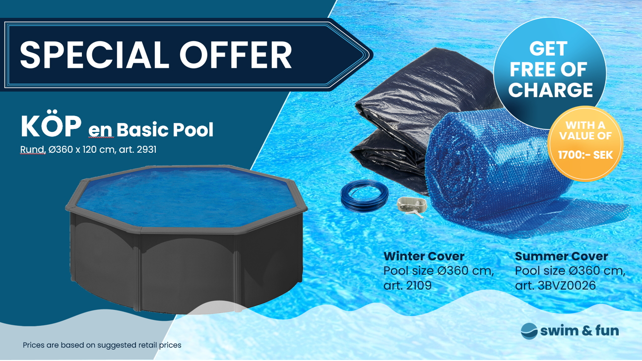 Poolpaket komplett med rund fristående familjepool och stort tillbehörspaket Ø3,60 x 1,2 m. Kampanj se nedan sommar & vintertäckning på köpet