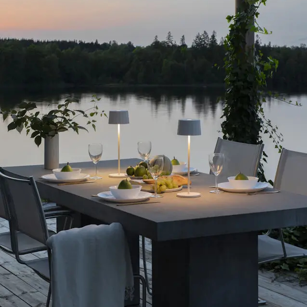 Positano är en stilren bordslampa med ställbar belysning där man kan välja färgtemperatur antingen 2700K eller 3000K och är dimbar. Den passar lika bra inne i vardagsrummet som på uteplatsen. Laddas via USB och har en batteritid på ca 9 timmar vid full ljussstyrka. Av/på knapp i touch på skärmen. Svart lackad aluminium.