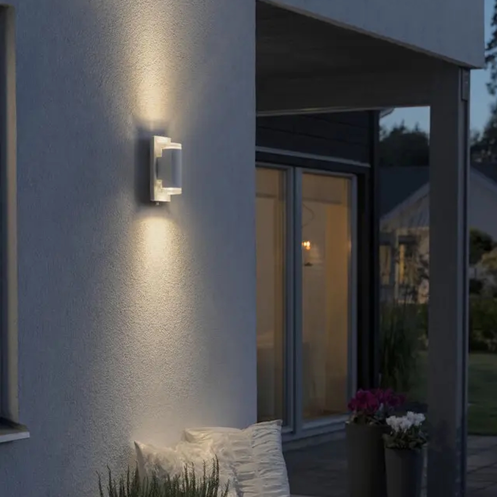 Potenza fasadbelysning i antracitgrå lackad aluminium med klart akrylglas, ljusflöde uppåt och nedåt.