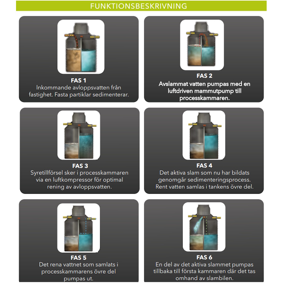 Hela reningsverket styrs av en luftpump och en styrdator, allt monteras ovan jord så man inte riskerar översvämning i elektroniken. Mellan tanken och styrskåpet går det enbart luftslangar, styrskåpet går att placera upp till 8m från tanken.