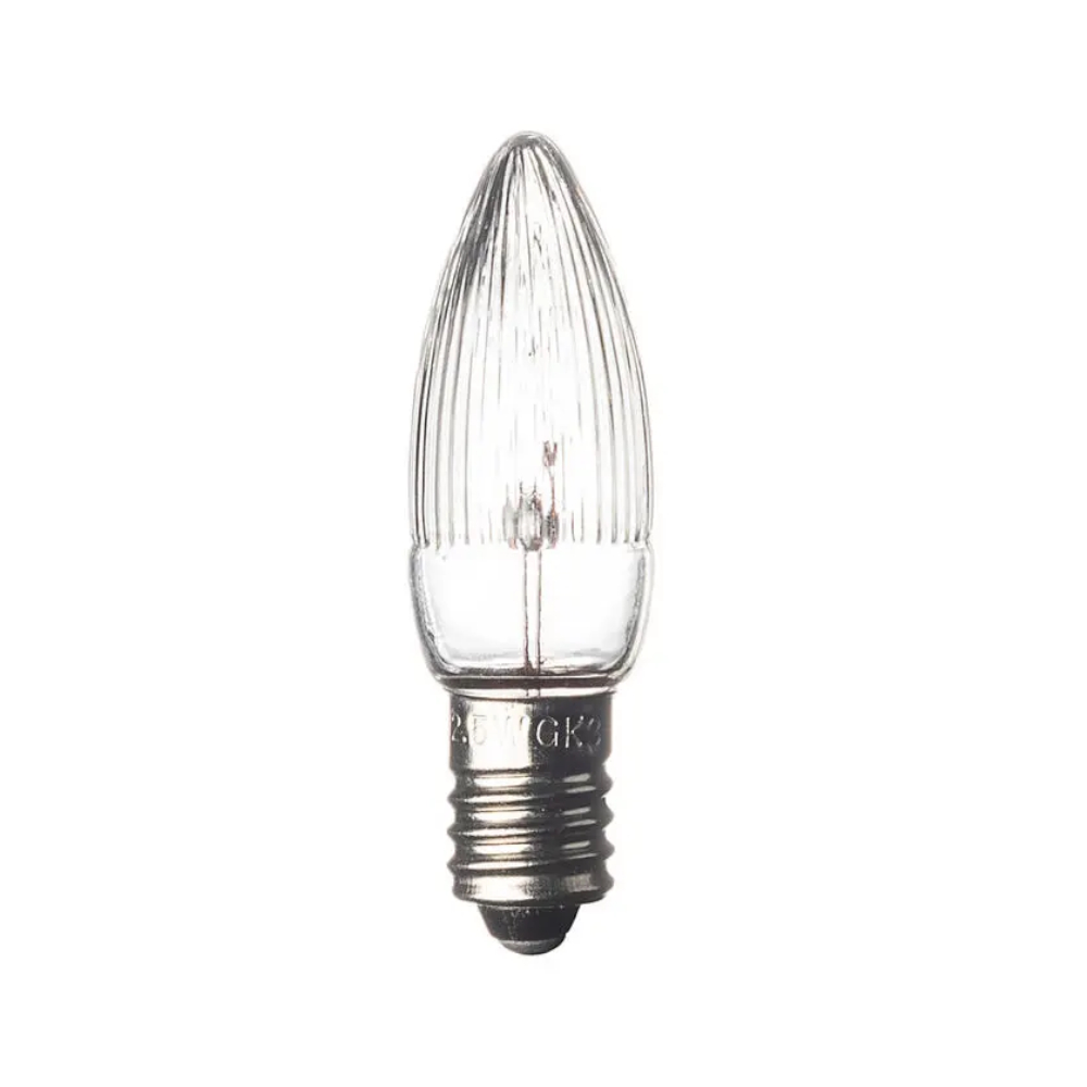 Uppsättning med tre E10-socklade glödlampor på 12 V och 3 W, avsedda för inomhusbruk. Lamporna har en klar glaskropp och avger ett varmvitt ljus, vilket ger en mjuk och behaglig belysning. De är särskilt användbara för att ersätta trasiga eller saknade lampor i ljusslingor, vilket säkerställer att hela dekorationen fungerar som den ska.