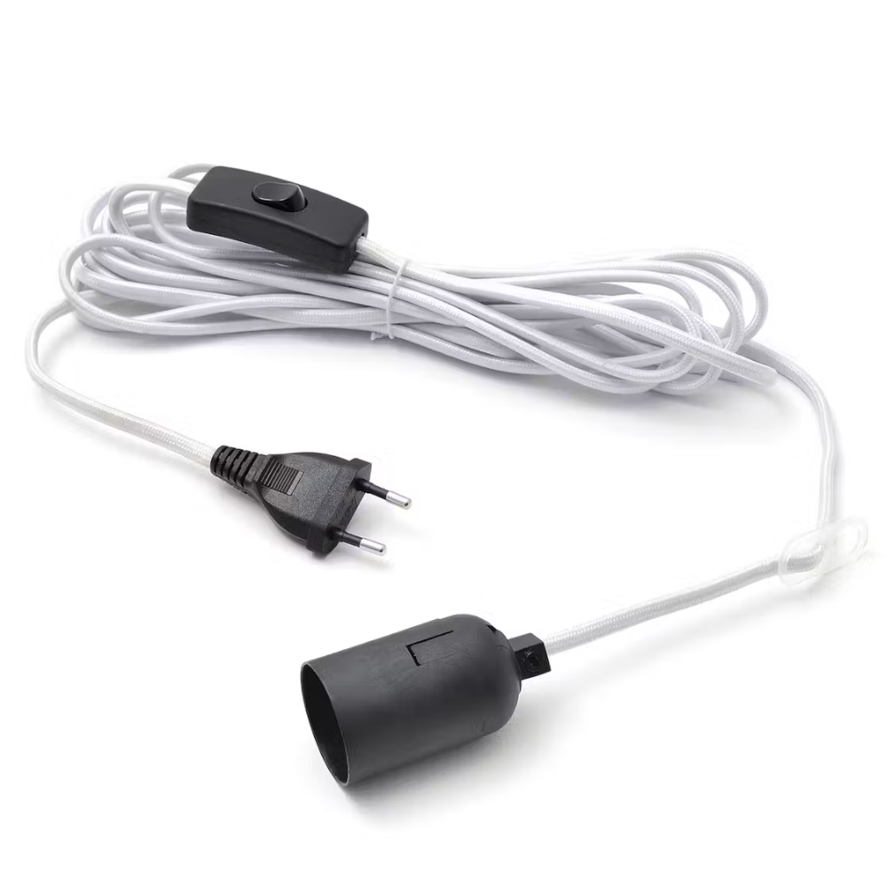 Ett sladdställ med vit textilklädd sladd på 5 meter, med inbyggd strömbrytare och E27-sockel för ljuskälla, produkten är för inomhusbruk.
