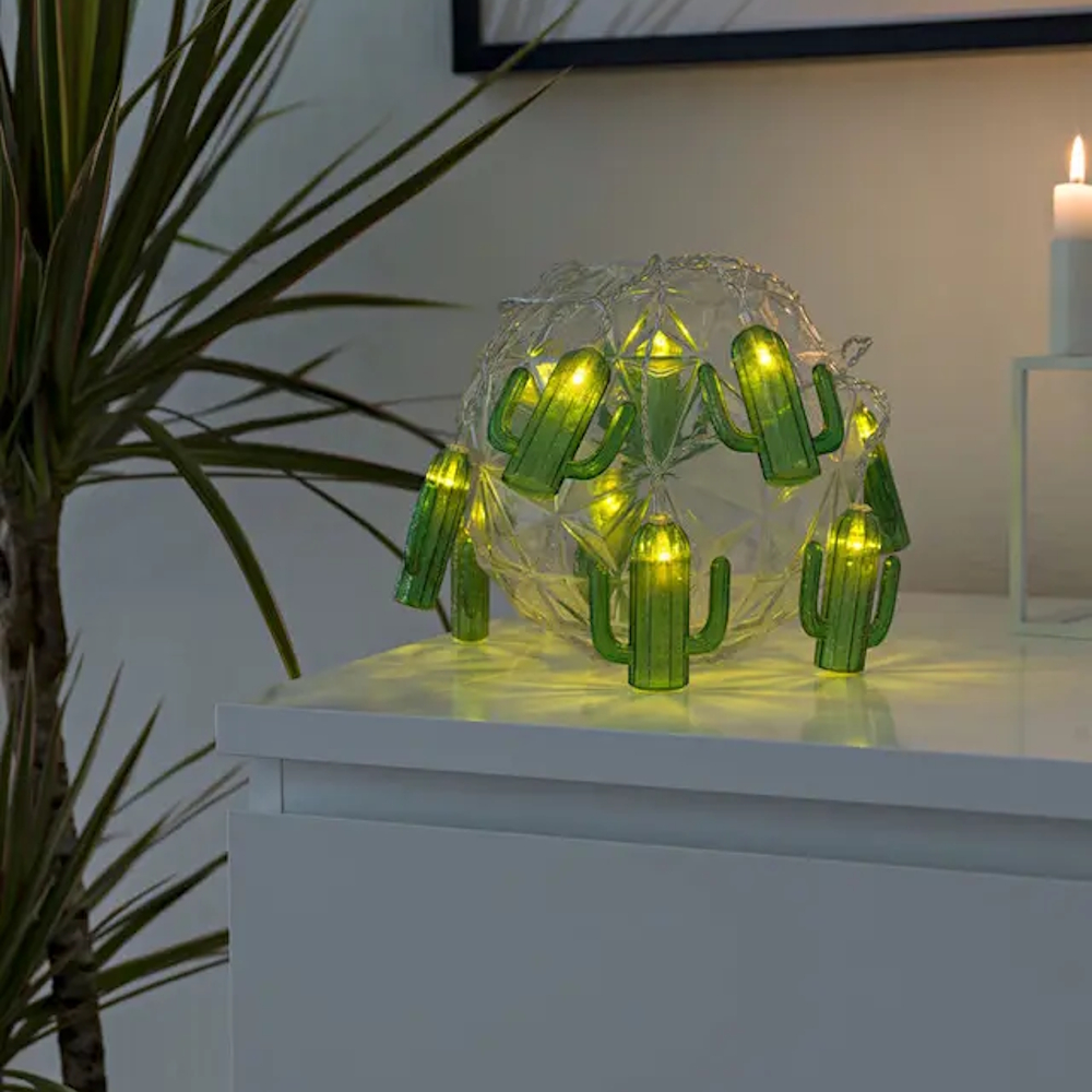 Batteridriven ljusslinga från Konstsmide med 10 små kaktusar, inuti varje kaktus sitter en liten LED-lampor som lyser i ett varmvitt ljussken.