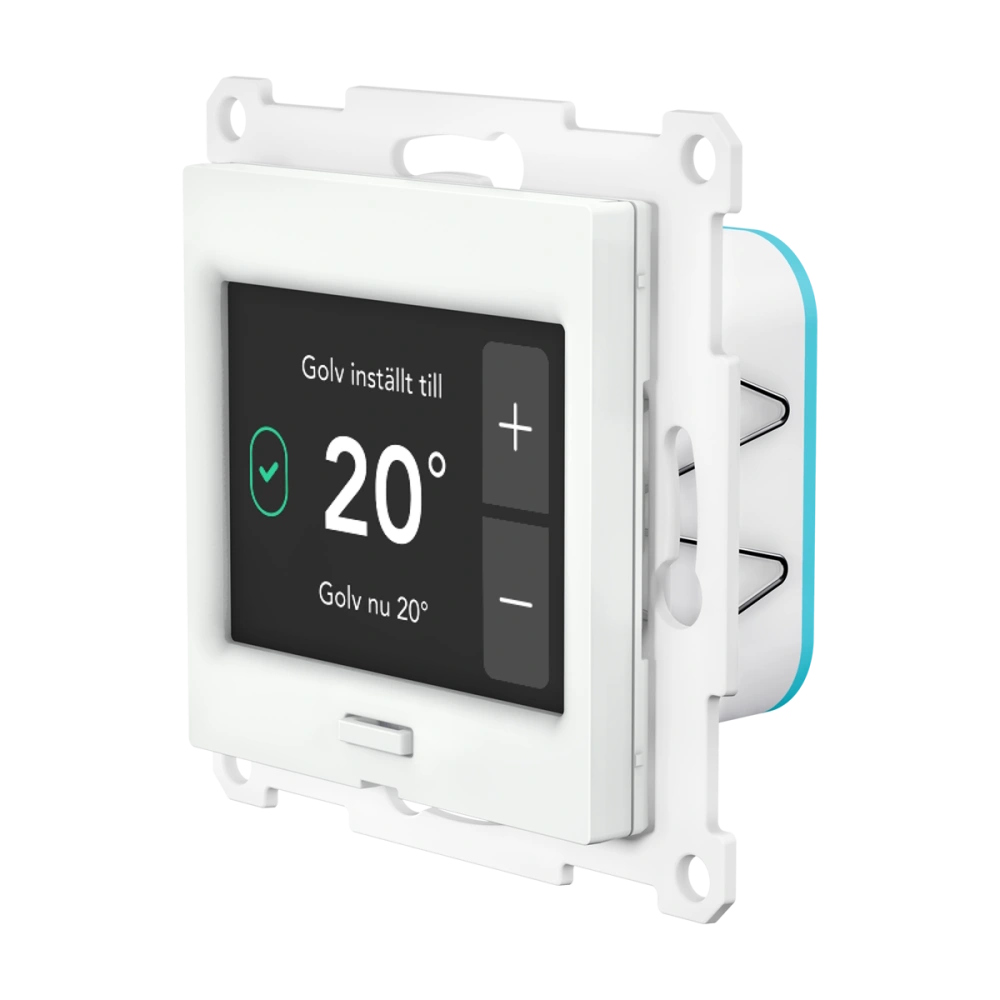 TRM-01 är en termostat för elburen golvvärme med en skärm för att styra och visa temperatur och värmeläge. Den klarar last upp till 16A, har inbyggd rumsgivare och medföljande golvgivare. Den kan också användas med befintlig golvgivare eller som regulator (PWM). TRM-01 kan automatiseras för energibesparing genom t.ex. dag- och nattsänkning. Med Gateway (GWY-01, ej inkluderad) kan produkten styras på distans och med elprisoptimering. AW – Passar med mattvit ram SG Install.