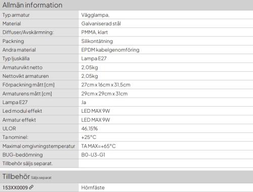 Väggarmatur i galvaniserad stål, Klar polykarbonat, Opalvitt polykarbonat kan beställas till alla Stockholms modeller. 46W E27, IP54 Klass II. Höjd 310mm. Tillbehör hörnfäste Art:153 galv E.nr:7722488, Art 153 svart E.nr:7722489, Art:153 vit E.nr:7722299.