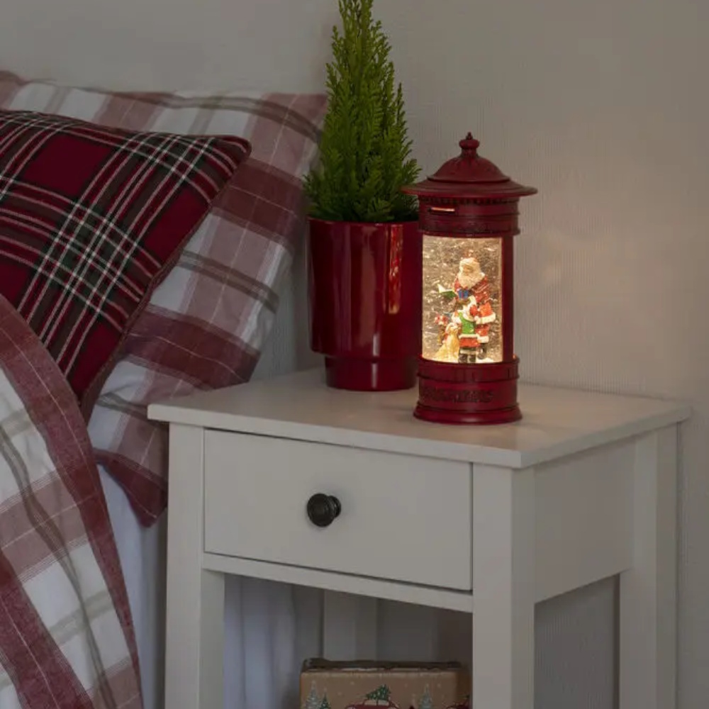 Festlig, vattenfylld juldekoration i form av en engelsk brevlåda med tomte och hund. Glittret virvlar runt som i en snöglob och skapar en magisk julkänsla. Varmvit LED‑belysning och utrustad med en praktisk 5‑timmars timer samt möjlighet till både batteridrift och USB‑anslutning för enkel placering.