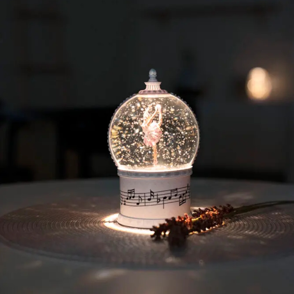Snöglob med ballerina som dansar till musik i rosa klänning, virvlande glitter och roterande funktion med varmvit LED och timer på 5 timmar.