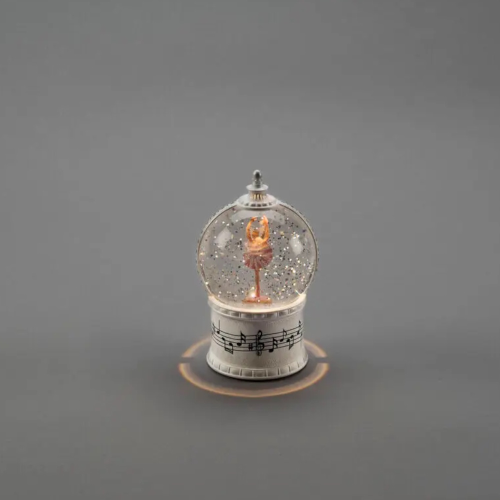 Snöglob med ballerina som dansar till musik i rosa klänning. Virvlande glitter och roterande funktion med varmvit LED och timer på 5 timmar. Drivs med 3xAAA batterier (ingår ej).