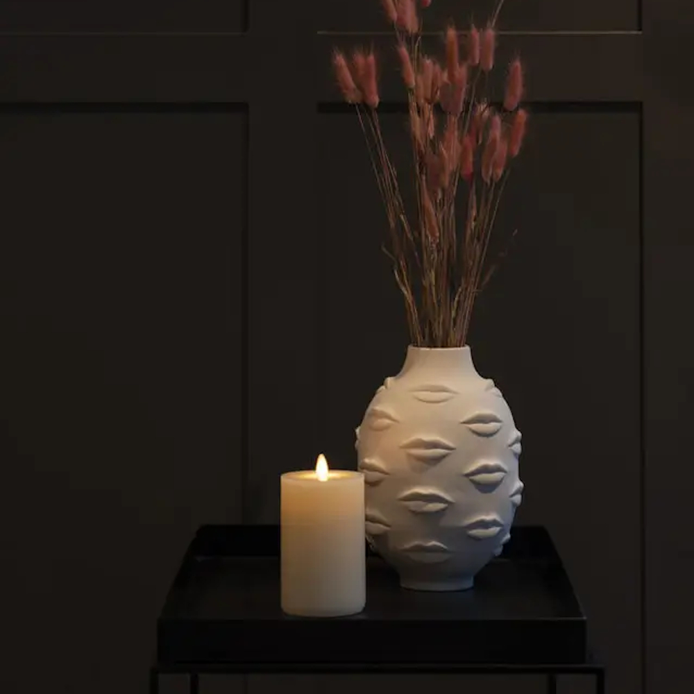 Gräddvitt vaxljus som drivs med 2xC batterier. Ljuset har en levande låga som går att blåsa ut, samt en touch-funktion på toppen för att starta och stänga av. Ljuset har en konstant doft av hounug och vanilj. Ljuset är enbart för inomhusbruk och har en timer på 5 timmar.