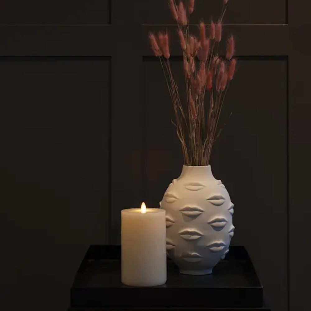 Gräddvitt vaxljus som drivs med 2xD batterier. Har en levande låga som går att blåsa ut, samt en touch-funktion för att starta och stänga av.