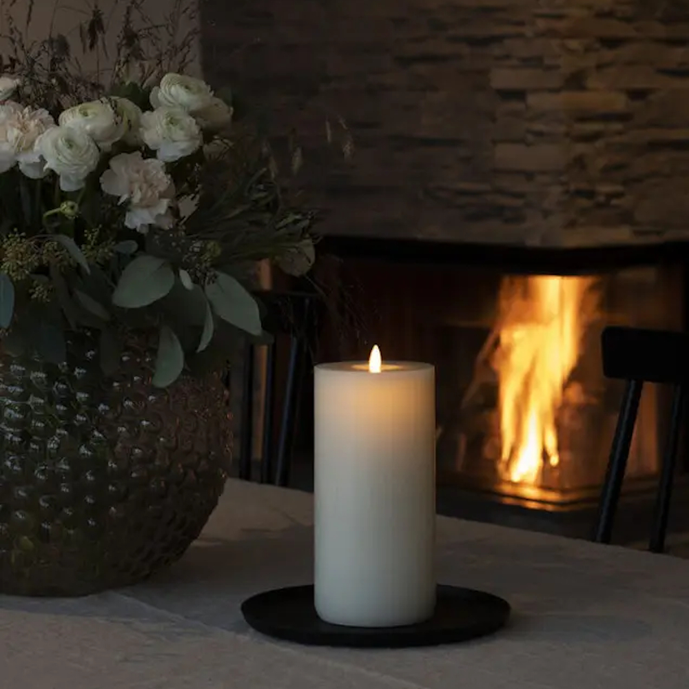 Gräddvitt vaxljus som drivs med 2xD batterier. Ljuset har en levande låga som går att blåsa ut, samt en touch-funktion på toppen för att starta och stänga av. Ljuset har en konstant doft av hounug och vanilj. Ljuset är enbart för inomhusbruk och har en timer på 5 timmar.